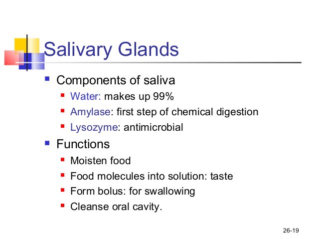 Saliva is a slippery liquid that lubricates food so that it can smoothly pass through the food pipe. THE MOUTH SALIVARY GLANDS AND OESOPHAGUS α-Amylase is the major digestive enzyme in saliva. Why is amylase active in mouth.